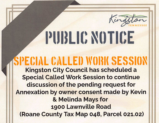 Kingston City Council has scheduled a special called work session to continue discussion of the pending request for annexation by owner consent made by Kevin