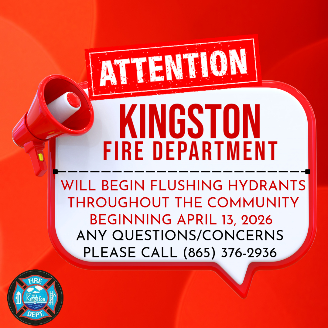 The Kingston Fire Department will begin flushing hydrants throughout the community beginning April 13, 2026. If you have any questions or concerns please call 865-376-2936.